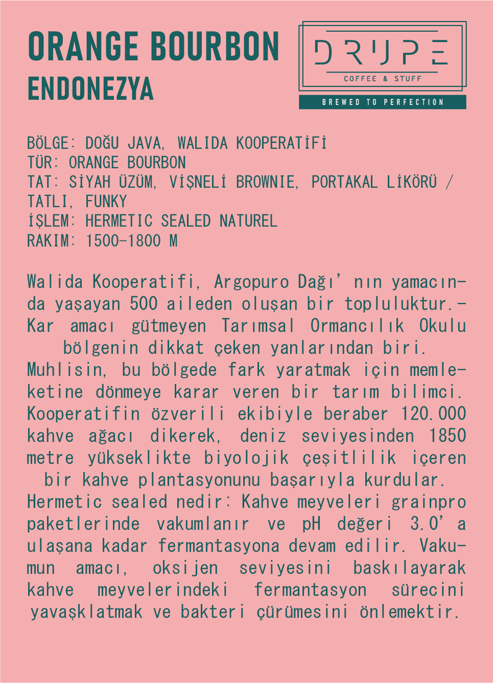 BÖLGE: DOĞU JAVA, WALIDA KOOPERATİFİ TÜR: ORANGE BOURBON TAT: SİYAH ÜZÜM, VİŞNELİ BROWNIE, PORTAKAL LİKÖRÜ TATLI, FUNKY İŞLEM: HERMETIC SEALED NATUREL RAKIM: 1500-1800 M